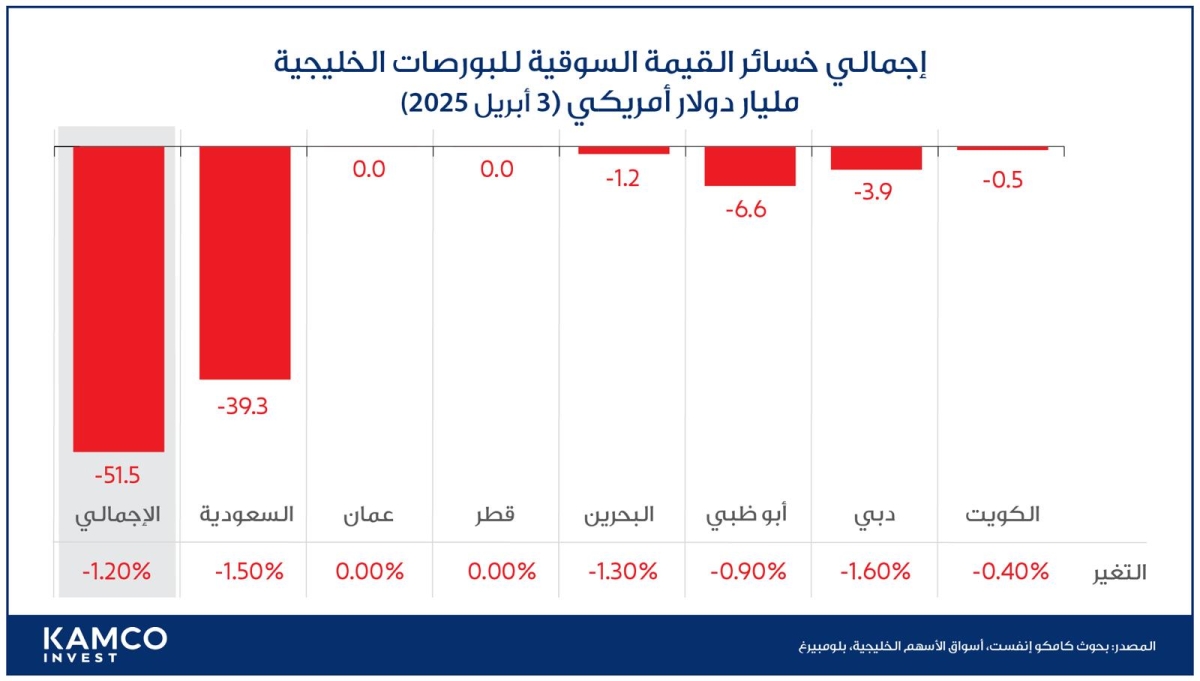 وسجلت بورصات الخليج اليوم خسائر سوقية تقارب 51.5 مليار دولار، منها 500 مليون دولار للكويت (قطر وعُمان مغلقتان).