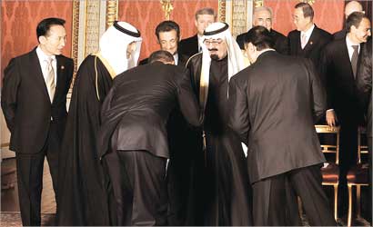 الرئيس الأميركي يصافح خادم الحرمين الشريفين محنيا هامته احتراما وسط حشد من قادة الدول (ا ف ب)