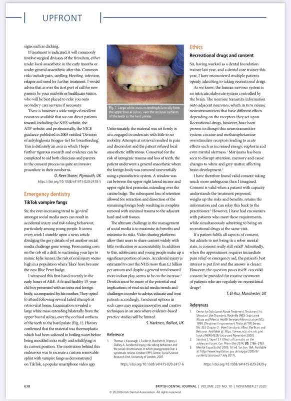 والمقالة نُشرت لها في مجلة طب الأسنان البريطانية
