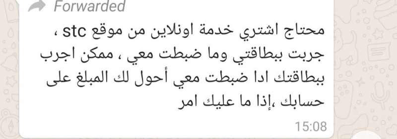 وبمجرد الرد التقليدي برد التحية، يتفاجأ الصديق المستهدف عشوائياً من «الهاكرز» على الفور برسالة جديدة مضمونها «أحتاج أشتري خدمة أونلاين من موقع ( )، جربت ببطاقتي وما ضبطت معي، ممكن أجرب ببطاقتك إذا ضبطت معي أحول لك المبلغ على حسابك، إذا ما عليك أمر».
