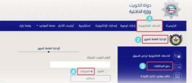 أعلنت وزارة الداخلية إطلاق خدمة دفع المخالفات المرورية للشركات على موقع الوزارة الإلكتروني (www.moi.gov.kw)، وذلك استكمالا لتطوير أنظمة وخدمات الوزارة كافة.