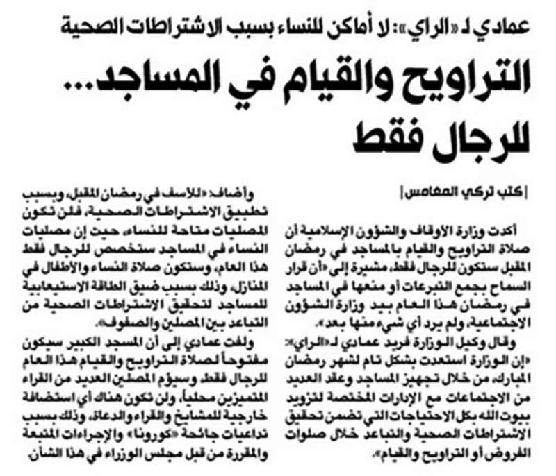 واختتمت بالإشارة إلى أن «ثمة دولاً خليجية قصرت صلاة التراويح على 30 دقيقة مع استمرار إغلاق مصليات النساء».