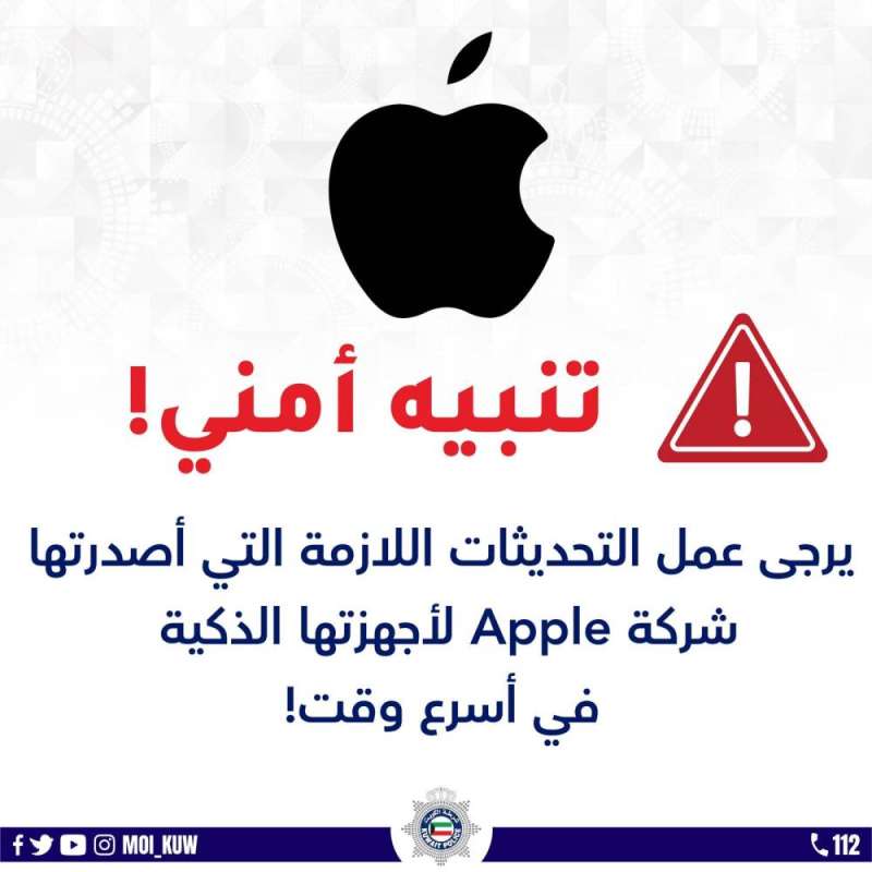 أصدرت وزارة الداخلية اليوم الأربعاء تنبيهاً أمنياً بضرورة عمل التحديثات اللازمة على أجهزة «آبل» في أسرع وقت.