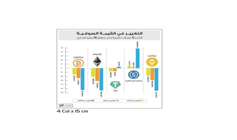 خسرت العملات المشفرة في 10 أيام 486 مليار دولار، أي ما يعادل نحو 27 في المئة من قيمتها السوقية، متراجعة من 1.803 تريليون دولار في 5 مايو إلى 1.317 تريليون في إغلاقات أول من أمس وفقاً لبيانات منصة «كوين ماركت كاب»، ليبلغ تراجعها في شهر نحو 564 مليار دولار (-29.98 في المئة) في شهر، فيما وصلت خسائرها في 6 أشهر إلى 1.49 تريليون دولار (-53.08 في المئة) مقارنة بـ2.807 تريليون دولار في إغلاقات 15 نوفمبر من العام الماضي.