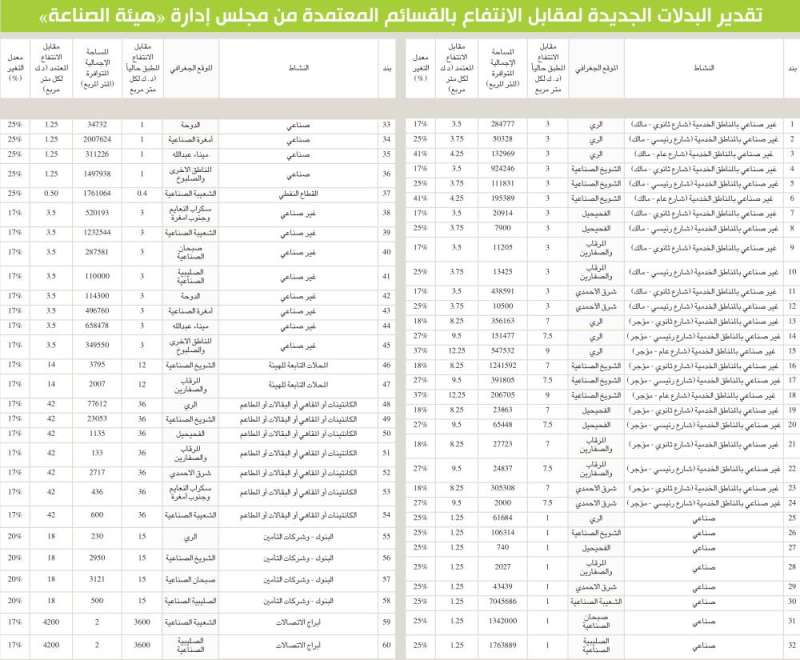 ووفقاً للدراسة المعتمدة من المرتقب زيادة بدل انتفاع قسائم أكثر من 13 منطقة صناعية بواقع 25 في المئة، تشمل الري والشويخ الصناعية وصبحان وشرق الأحمدي والمرقاب والصفارين والفحيحيل إلى جانب أمغرة الصناعية وميناء عبدالله والشعيبة الصناعية والدوحة إضافة إلى الصليبية الصناعية والمناطق الأخرى والصلبوخ.