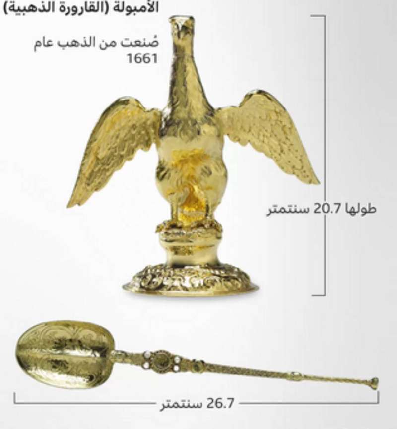 والتاج المصنوع من الذهب الخالص عيار 22 قيراط يعود لأكثر من 360 عاماً، يبلغ ارتفاعه 30 سم ووزنه 2.23 كيلو غرام.