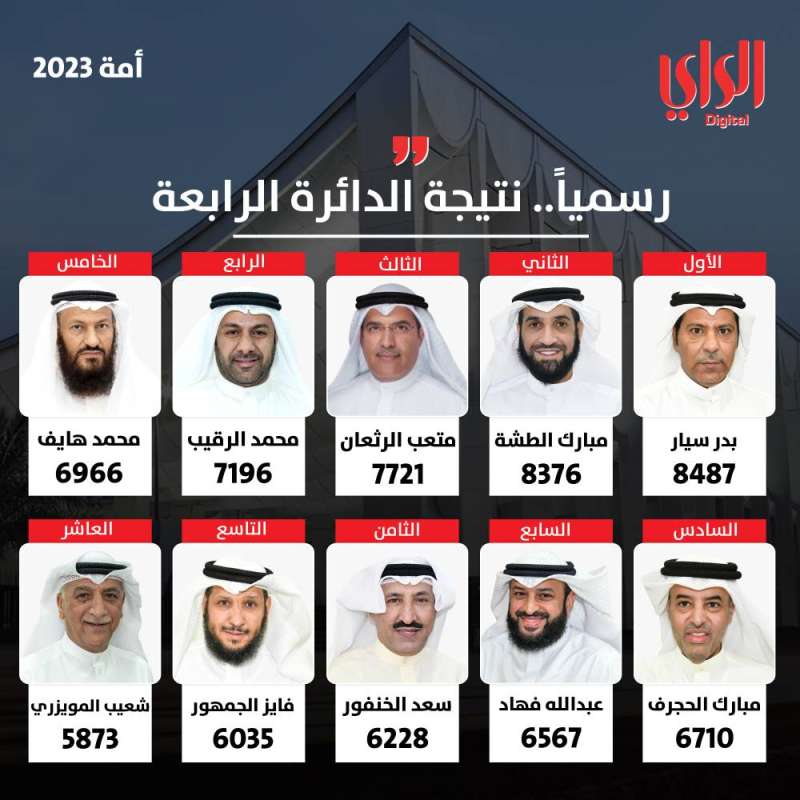 أعلنت اللجنة الرئيسية في الدائرة الرابعة لانتخابات مجلس الأمة (أمة 2023) فوز المرشحين العشرة التالية أسماؤهم بعضوية المجلس في الانتخابات، وجاءت وفق الترتيب التالي: