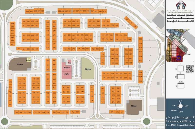 أعلنت المؤسسة العامة للرعاية السـكنية بأنها ستقوم بتوزيع الدفعة الرابعة عشر من (N4) في القسائم الحكومية بمشروع جنوب مدينة سعد العبدالله والتي تشتمل على (262) قسيمه بمساحة 400 متر مربع للمخصص لهم حتى تاريخ 9/8/2004.