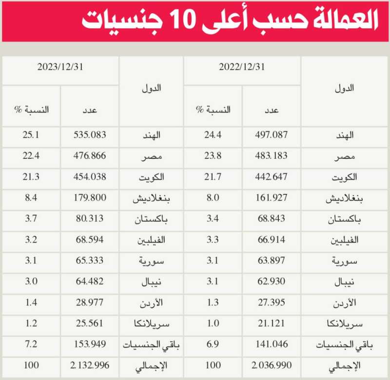 احتلت الجنسية الهندية المرتبة الأولى بعدد عمالتها حيث بلغ عددهم 535083 فرداً في ديسمبر 2023 مقارنة بـ497087 فرداً قبل سنة، تليها الجنسية المصرية بالمرتبة الثانية حيث بلغ عدد عمالتها 476866 فرداً مقارنة بـ483183 فرداً قبل سنة، ثم الجنسية الكويتية في المرتبة الثالثة حيث بلغ عدد العمالة الكويتية 454038 فرداً في ديسمبر 2023.