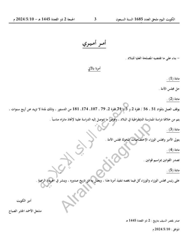 نص الأمر الأميري بحل مجلس الأمة ووقف بعض مواد الدستور