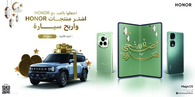 كشفت «HONOR»، العلامة التجارية الرائدة في مجال الأجهزة الذكية عالمياً، عن مفاجآت رائعة لعملائها والجمهور، بمناسبة عيد الأضحى المبارك، وذلك ضمن حملة تطلقها تحت عنوان «احتفل بالعيد مع HONOR»، في الفترة من 1 إلى 30 يونيو الجاري، مبينةً أن في إمكان المشاركين الدخول في السحب للفوز بجوائز مثيرة، بما فيها سيارة «Jetour T2 4x4» الفاخرة الجديدة.