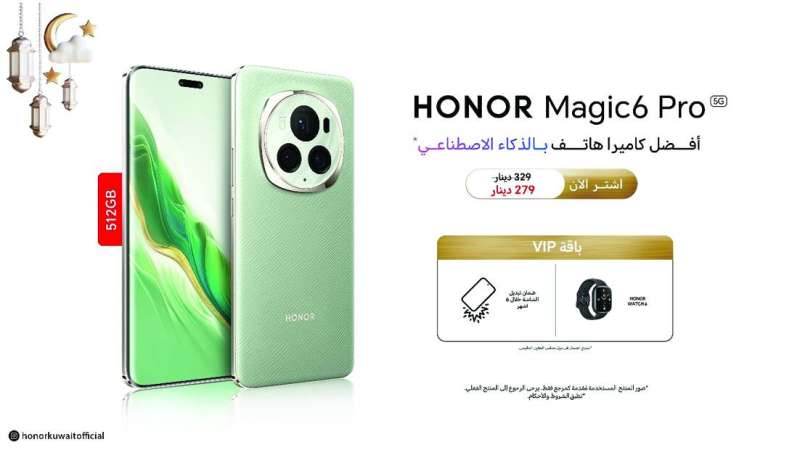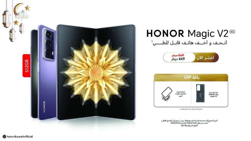 وعن قائمة المنتجات والعروض المؤهلة للحملة، ذكرت الشركة، أنها هاتف HONOR Magic V2 أنحف وأخف هاتف قابل للطي، شاشته OLED بحجم 7.92 بوصة، بألوان زاهية ورؤى مذهلة، وسيكون الجهاز متاحاً مع استرداد نقدي بقيمة 120 ديناراً، وضمان تبديل الشاشة خلال 6 أشهر.