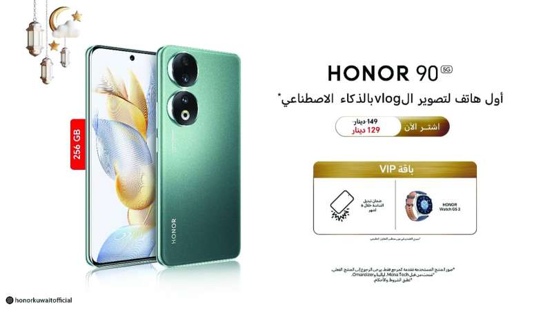 وسيكون HONOR 90 256GB متاحاً بـ129 ديناراً مع HONOR Watch GS 3 وضمان تبديل الشاشة خلال 6 أشهر.