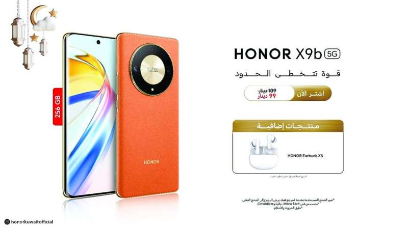 وسيكون HONOR X9b متاحاً بسعر خاص 99 ديناراً بدلاً من 109، إضافة إلى سماعات HONOR Earbuds X5، ومن العروض الجذابة، HONOR X7b 5G ببطارية طويلة الأمد، ويعد جهازاً مثالياً للاستخدام اليومي بفضل بطاريته سعة 6000 مللي أمبير، وسيكون HONOR X7b 5G متاحاً بسعر 64.9 دينار وسيتضمن سماعات HONOR Earbuds X5.