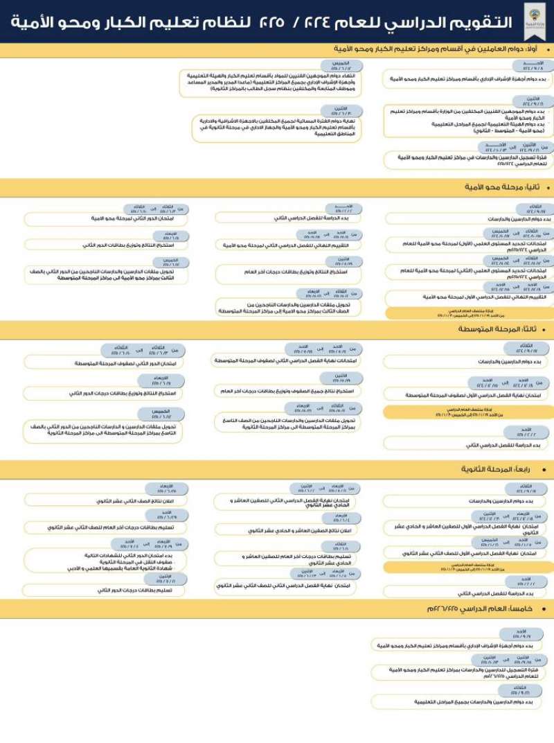 اعتمدت وزارة التربية التقويم الدراسي للعام 2024 /2025 لنظام تعليم الكبار ومحو الأمية للعاملين والمتعلمين في أقسام ومراكز تعليم الكبار ومحو الأمية بالإضافة إلى الإجازات والعطل الرسمية.