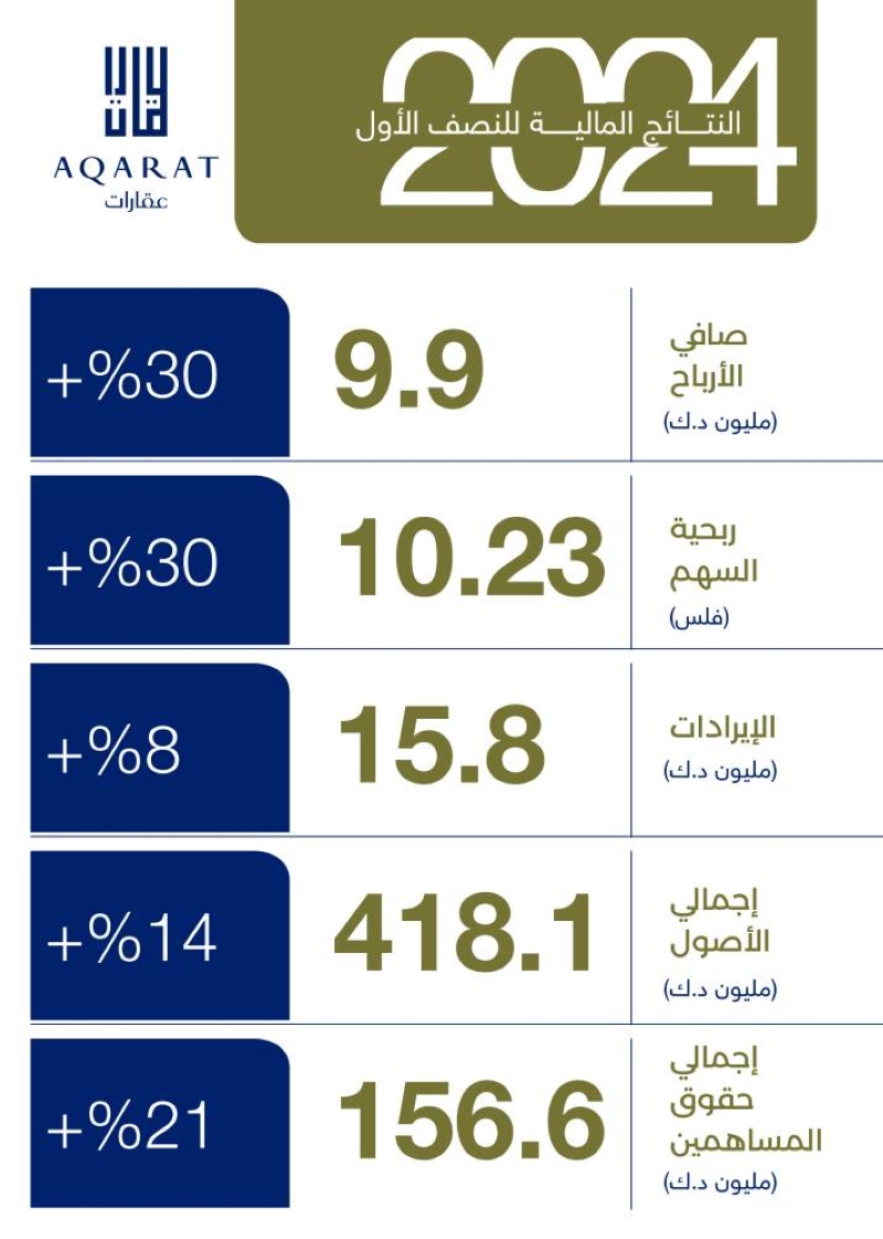 اعتمد مجلس إدارة شركة عقارات الكويت نتائج الشركة المالية عن الأشهر الستة الأولى من 2024، والتي أظهرت نمواً بنسبة 30.3 في المئة مقارنة بالفترة ذاتها من العام الماضي. حيث حققت الشركة أرباحاً صافية بلغت 9.9 مليون دينار، أي بربحية 10.23 فلس للسهم، مقارنة بـ7.6 مليون، وبربحية 7.85 فلس للفترة ذاتها 2023.