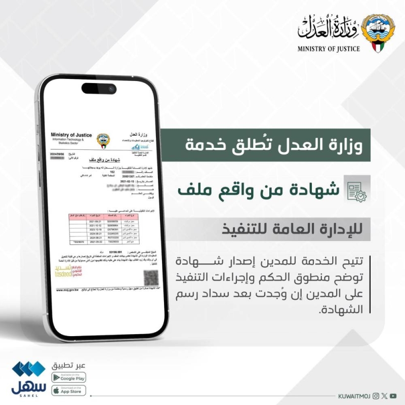 «العدل» تطلق خدمة «شهادة من واقع ملف تنفيذ» عبر «سهل»