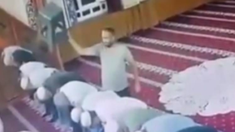 أظهر مقطع فيديو، تم تداوله أخيراً، رجلا يضرب إمام مسجد في تركيا بكرسي على رأسه خلال صلاة الجمعة.