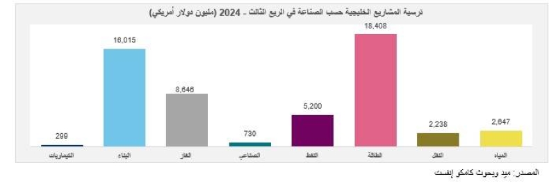 وتعزى الزيادة السنوية لقيمة المشاريع المسندة بصفة رئيسية إلى القفزة التي شهدتها قيمة العقود المسندة ضمن قطاع الطاقة والتي ارتفعت من 1.4 مليار دولار في الربع الثالث من العام 2023 إلى 16.6 مليار في الربع الثالث من العام 2024.