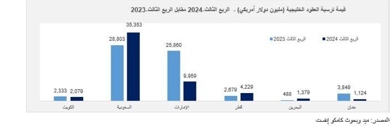 ووزعت قيمة العقود المسندة في الدول الخليجية بالتساوي خلال الربع الثالث من العام 2024، إذ سجلت 3 من 6 دول خليجية نمواً على أساس سنوي في قيمة المشاريع التي تمت ترسيتها، بينما شهدت الأسواق الثلاثة المتبقية انخفاضاً على أساس سنوي خلال هذا الربع.