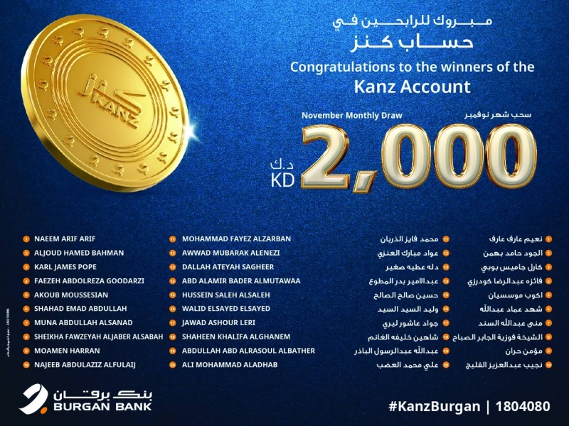 أفاد بنك برقان أمس، بأسماء عشرين فائزاً في السحب الشهري لحساب كنز، والذين سيحصل كل منهم على جائزة نقدية بقيمة ألفي دينار.