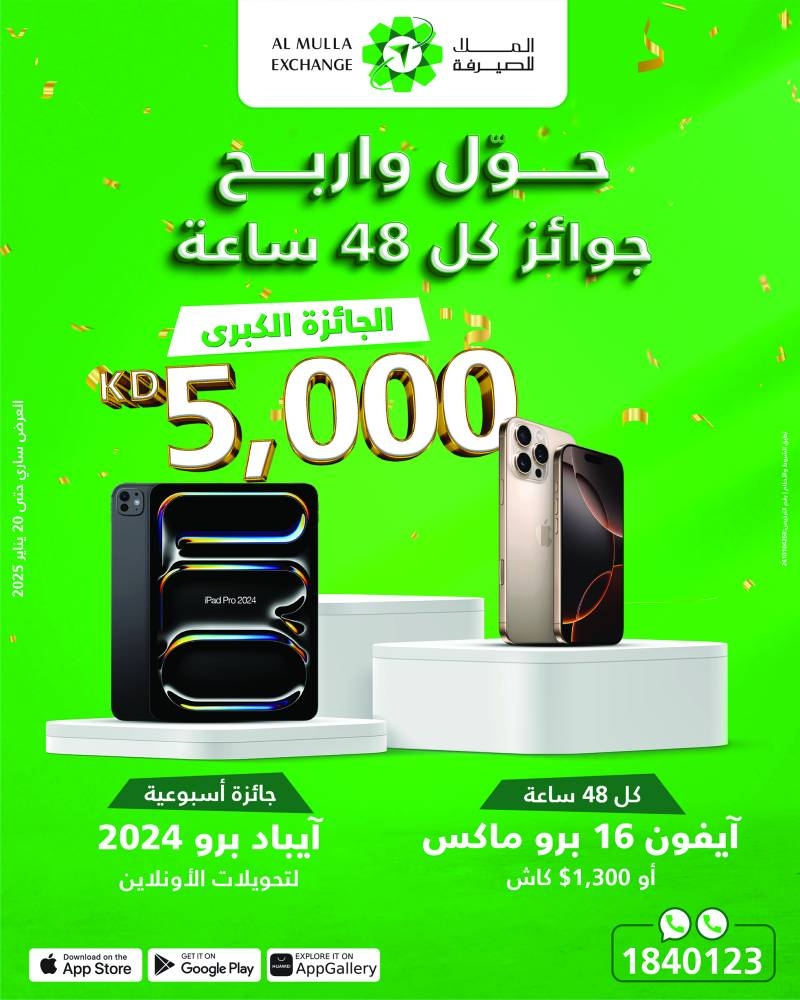 وأعلنت «الملا للصيرفة» عن حملتها الترويجية الجديدة، التي تمنح العملاء فرصة الفوز بجوائز مذهلة مع كل عملية تحويل، حيث سيتمكن العملاء -الذين يحولون الأموال من خلال أي من فروع شركة الملا للصيرفة، التطبيق، الموقع الإلكتروني، أو مكائن التحويلات ذاتية الخدمة - من الدخول في سحب للفوز بجوائز رائعة كل 48 ساعة.