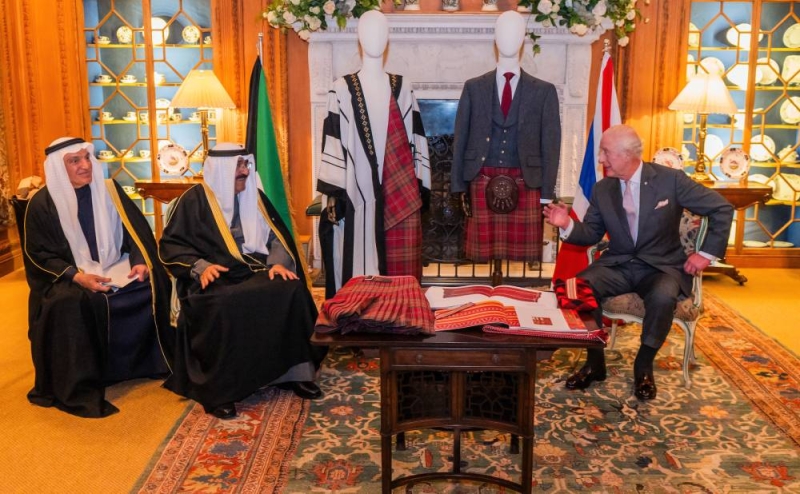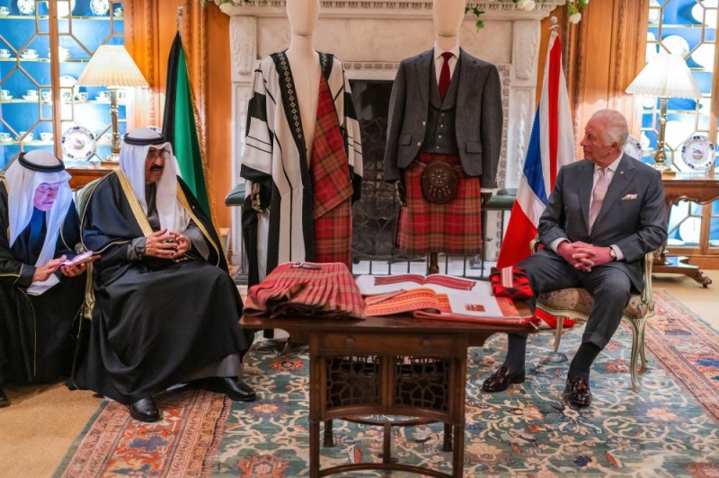 قام سمو أمير البلاد الشيخ مشعل الأحمد وملك المملكة المتحدة لبريطانيا العظمى وإيرلندا الشمالية الملك تشارلز الثالث، مساء يوم أمس الأربعاء، بتبادل الإزار الاسكتلندي والبشت المصنوع باستخدام تصميم التارتان الخاص (شراكة 125 عاما) الذي يجمع بين مواد النسيج التقليدية والأنماط والألوان والتقنيات من كل من المملكة المتحدة والكويت وذلك في دمفريس هاوس بمقاطعة آيرشاير الاسكتلندية في المملكة المتحدة.