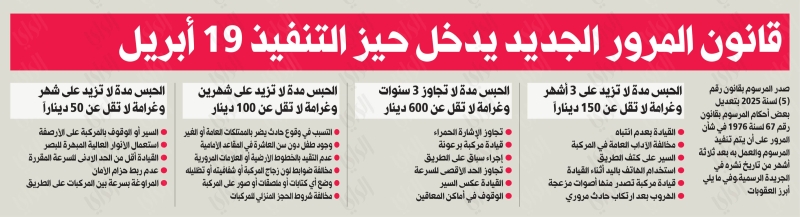 صدر اليوم الأحد المرسوم بقانون رقم (5) لسنة 2025 بتعديل بعض أحكام المرسوم بقانون رقم 67 لسنة 1976 في شأن المرور على أن يتم تنفيذ المرسوم والعمل به بعد ثلاثة أشهر من تاريخ نشره في الجريدة الرسمية.وفيما يلي نص المرسوم: