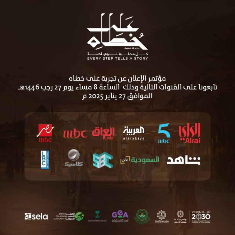 بحضور رفيع يتقدمه أمير المدينة المنورة في المملكة العربية السعودية صاحب السمو الملكي الأمير سلمان بن سلطان بن عبدالعزيز ورئيس مجلس إدارة الهيئة العامة للترفيه المستشار تركي آل الشيخ وعدد من الوزراء والمسؤولين والشخصيات، يعقد في الثامنة من مساء اليوم المؤتمر الصحافي للإعلان عن مشروع «على خطاه».