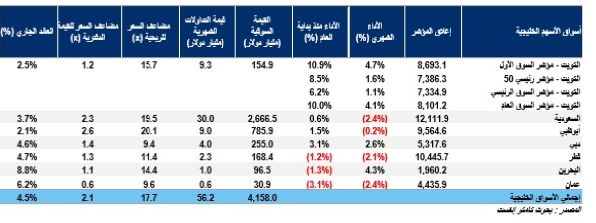 أما على صعيد الأداء منذ بداية 2025 حتى تاريخه، تمكنت الأسواق الخليجية من الحفاظ على مكاسبها، بنمو 2.6 في المئة، على خلفية الاستفادة من الزخم الإيجابي الذي شهدته في بداية العام.