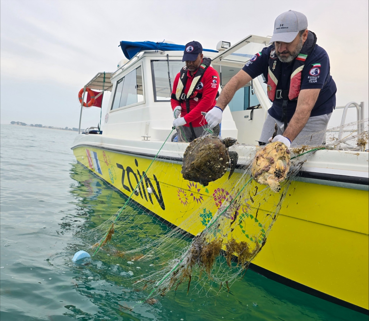 تمكن فريق الغوص الكويتي التابع للمبرة البيئية التطوعية من رفع شباك صيد مهملة جنوب بحر الكويت في (بنيدر) زنتها ثلاثة أطنان وإنقاذ الكائنات البحرية العالقة ومنها سلحفاة نادرة من نوع (ذات منقار الصقر) وتسليمها إلى المركز العلمي لإجراء اللازم.