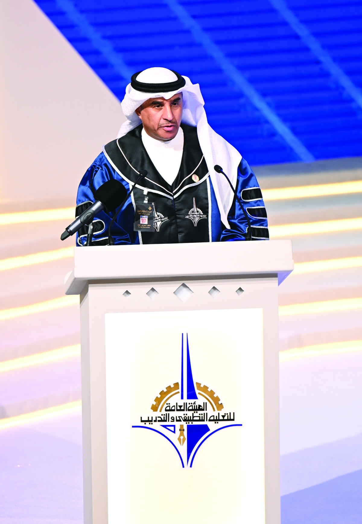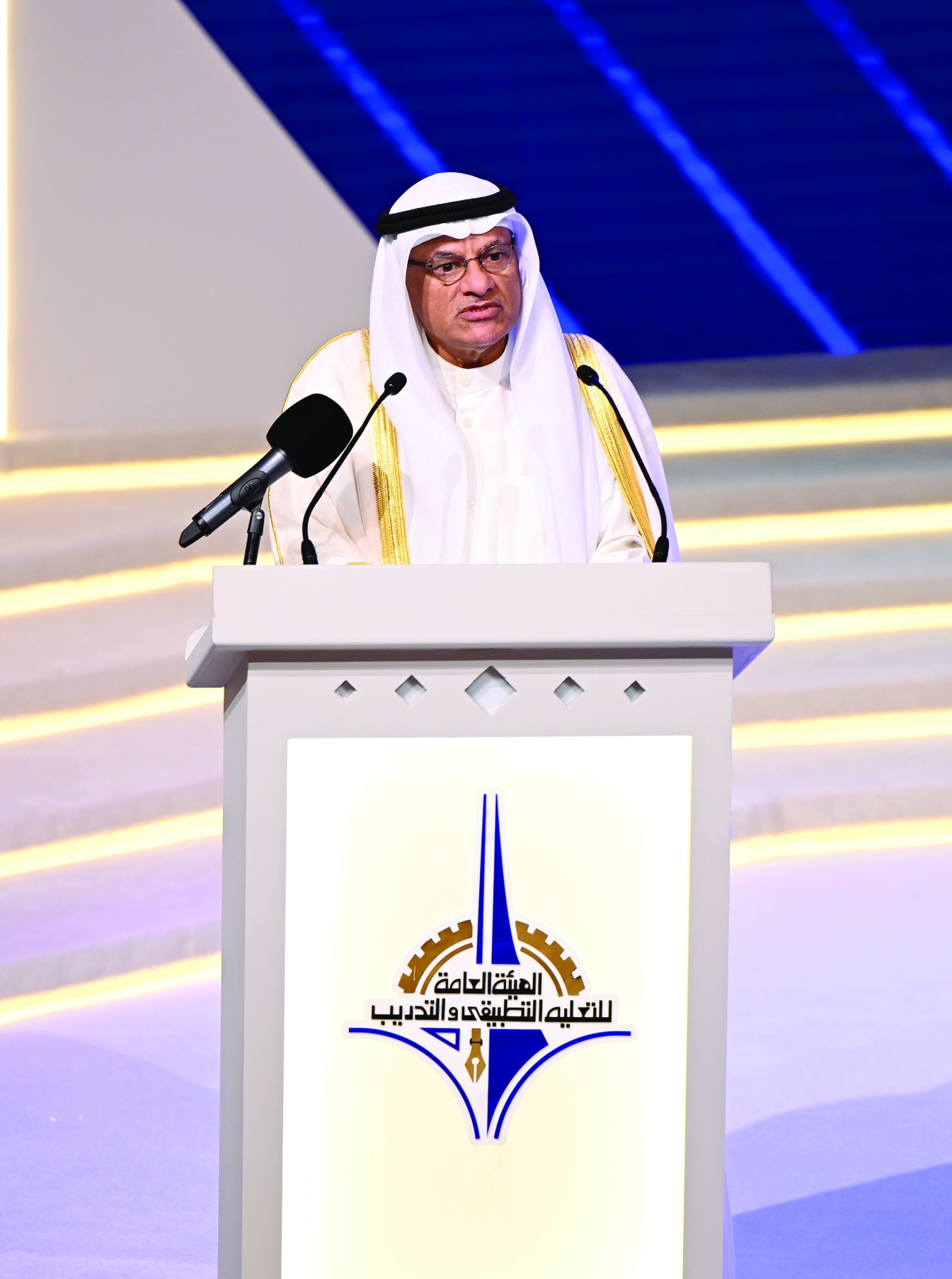 وأضاف: «اعترافاً وامتناناً لما تولونه من اهتمام ورعاية سامية للهيئة العامة للتعليم التطبيقي والتدريب، تلك المؤسسة التي تُمثّل حجر الزاوية في إعداد الكوادر الوطنية المزودة بالعلم والمعرفة والمهارات الفنية التي تسهم بفعالية في تلبية احتياجات قطاعات الدولة المختلفة، فقد أثبتت الهيئة من خلال برامجها ومناهجها أنها رافد أساسي في تزويد سوق العمل بالكوادر الوطنية المؤهلة القادرة على التكيف مع متطلبات التنمية الشاملة». وأشار إلى أن «ما نشهده اليوم من تحديث لبرامجها الأكاديمية والتدريبية وتوفير بيئة تعليمية محفزة وبناء جسور التعاون مع مؤسسات الدولة المختلفة لتخريج كوادر متميزة ومؤهلة تحقيقاً لرؤيتها في المواءمة بين مخرجات التعليم ومتطلبات التنمية المستدامة وسوق العمل المحلي، ما هو إلا انعكاس لرؤية وطنية طموحة تسعى إلى تمكين الشباب وتأهيلهم ليكونوا شركاء حقيقيين في تحقيق تطلعات دولتنا الغالية نحو مستقبل أكثر ازدهاراً واستدامة».