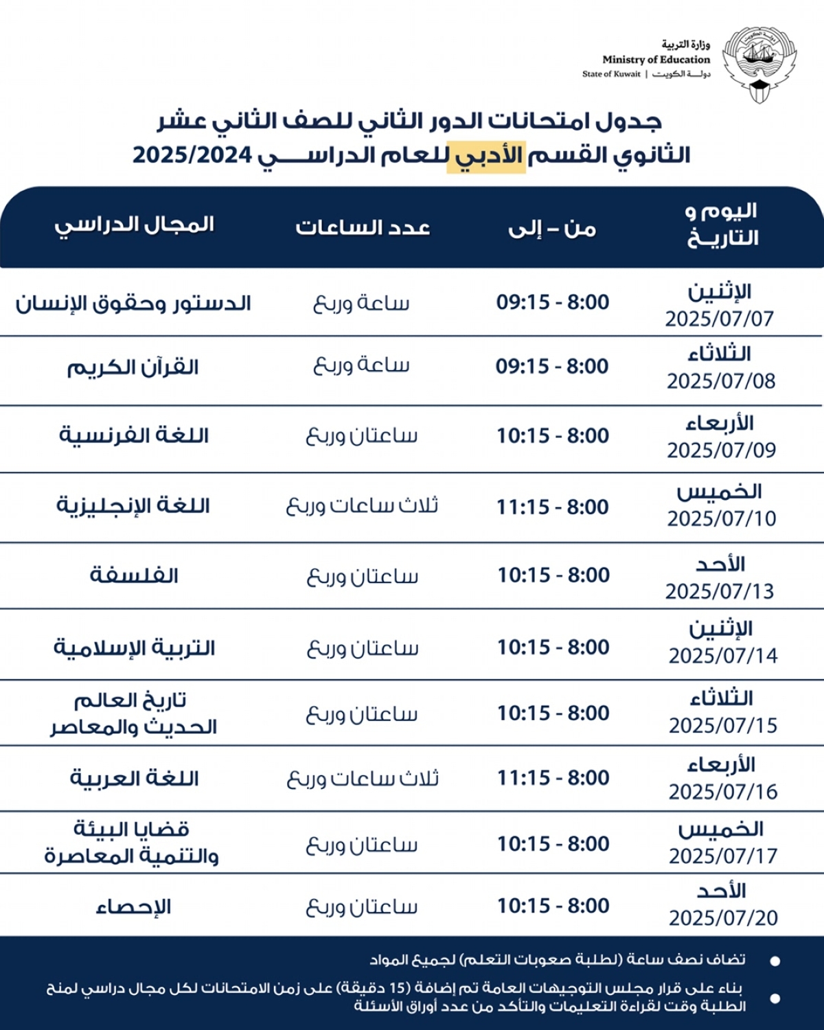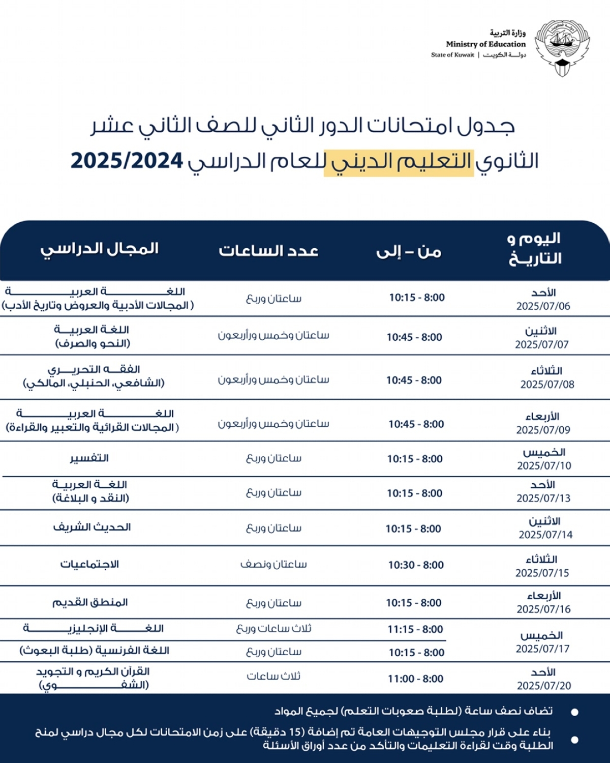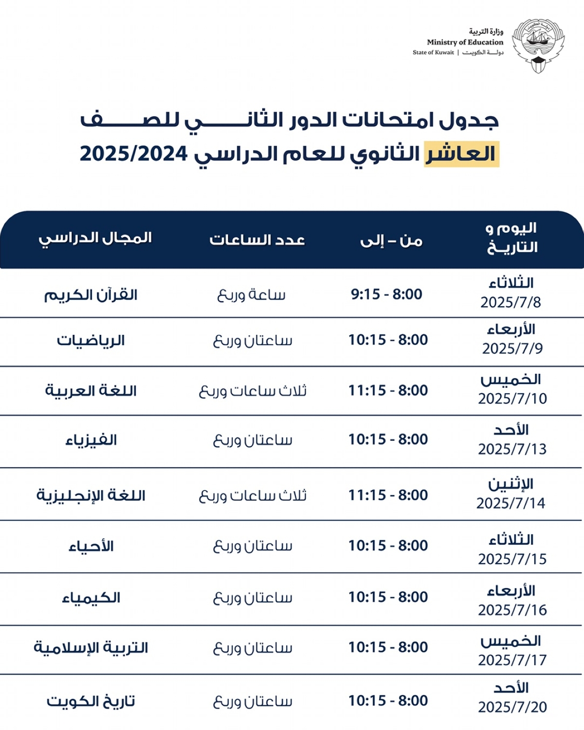 اعتمدت وزارة التربية جداول امتحانات الدور الثاني للصف العاشر والحادي عشر والثاني عشر الثانوي بقسميه العلمي والأدبي والتعليم الديني للعام الدراسي 2024/ 2025، والتي ستبدأ يوم 6 يوليو المقبل وحتى 20 يوليو.