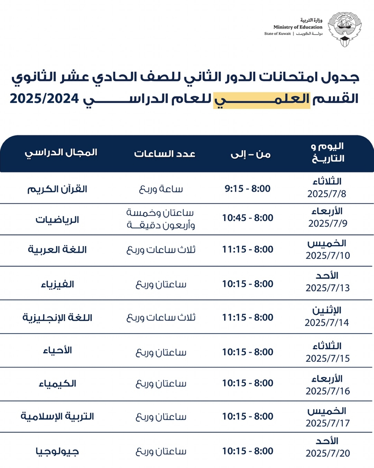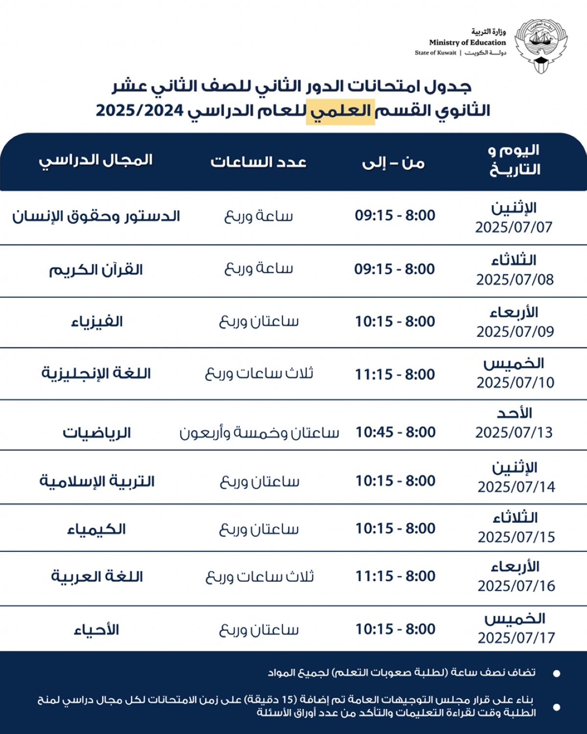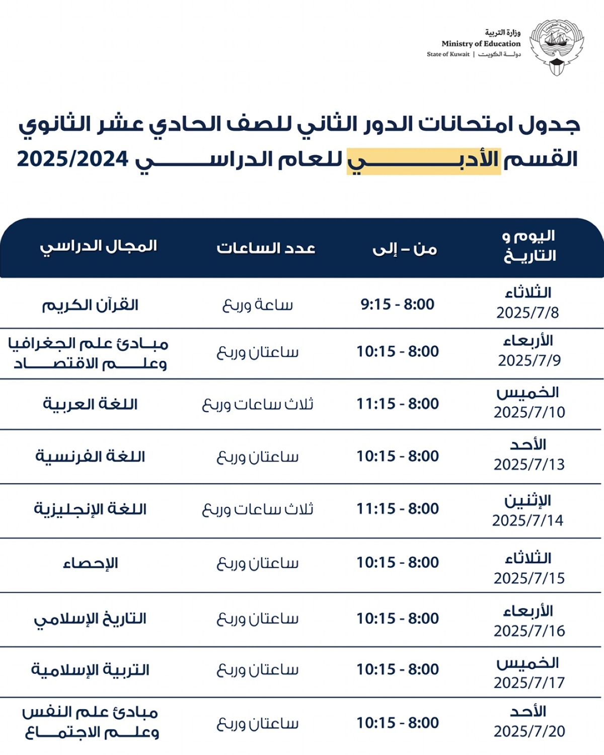 اعتمدت وزارة التربية جداول امتحانات الدور الثاني للصف العاشر والحادي عشر والثاني عشر الثانوي بقسميه العلمي والأدبي والتعليم الديني للعام الدراسي 2024/ 2025، والتي ستبدأ يوم 6 يوليو المقبل وحتى 20 يوليو.