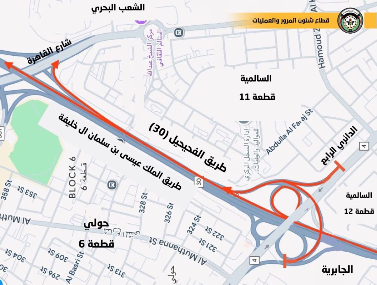 وكانت الإدارة العامة للمرور أعلنت إغلاق حارة الأمان والمسار الأيمن على طريق الملك عيسى بن سلمان ال خليفة (طريق 30) جهة منطقة السالمية، وكذلك إغلاق مدخل الدائري الرابع ومدخل شارع القاهرة باتجاه مدينة الكويت، اعتباراً من مساء أمس الخميس وحتى الانتهاء من أعمال الصيانة للطريق.