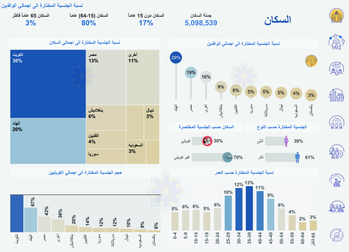 ووفق الأرقام، فإن 61 في المئة من سكان الكويت هم من الذكور بإجمالي 3.09 مليون رجل، مقابل مليوني أنثى، فيما تشكل الفئة العمرية الواقعة بين 35 و39 عاماً الأعلى نسبة في البلاد بإجمالي 13 في المئة من السكان.