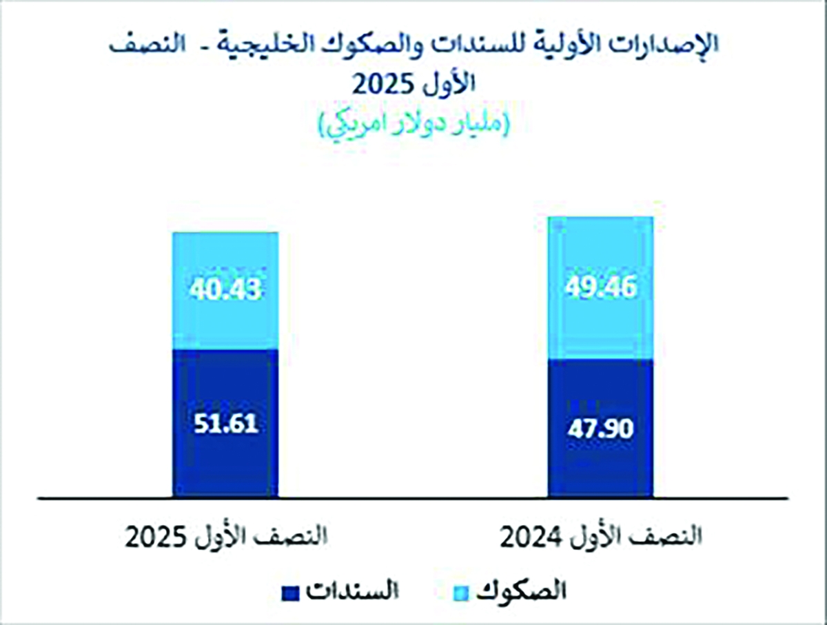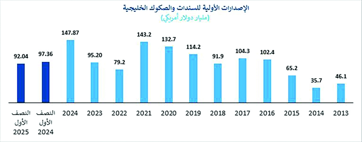 كشف تقرير شركة المركز المالي الكويتي «المركز» بعنوان: «أسواق السندات والصكوك الخليجية في النصف الأول 2025»، أن إجمالي الإصدارات الأولية للسندات والصكوك الخليجية بلغ 92.04 مليار دولار من خلال 215 إصداراً، بانخفاض 5.5 في المئة، مقارنة بالفترة ذاتها العام الماضي، حيث بلغت 97.36 مليار دولار.