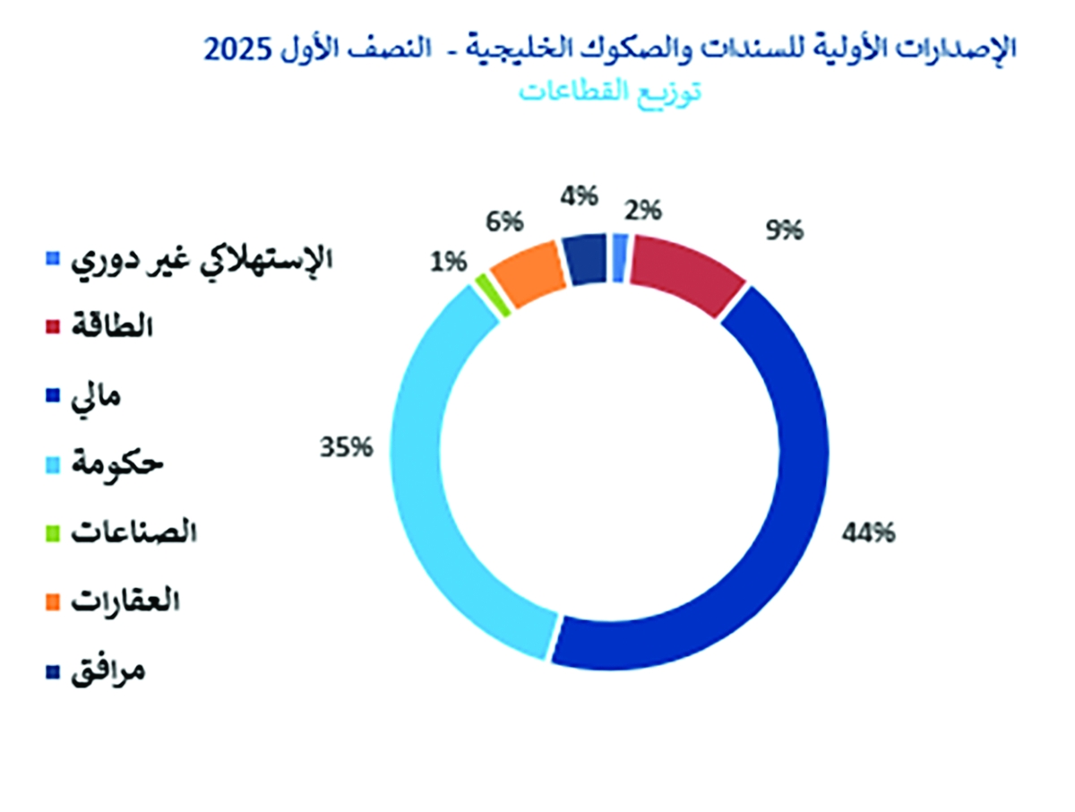 ولاحظ التقرير أن إصدارات القطاع المالي تصدرت من حيث إجمالي القيمة للإصدارات الأولية الخليجية من السندات والصكوك خلال النصف الأول 2025، بقيمة إجمالية 40.1 مليار دولار من خلال 167 إصدار، أو 43.6 في المئة من إجمالي قيمة الإصدارات، في حين حلت الإصدارات الحكومية في المرتبة الثانية بقيمة إجمالية بلغت 31.9 مليار دولار من خلال 25 إصدار، ممثلا 34.6 في المئة من إجمالي الإصدارات لهذا العام. وتشكل زيادة في الإصدارات من الفترة ذاتها من العام الماضي للقطاع المالي (31.1 %) وتشكل انخفاضاً للإصدارات الحكومية (48.2- %). وتليها إصدارات قطاع الطاقة بقيمة إجمالية بلغت 8.6 مليار من خلال 9 إصدارات ممثلة 9.4 في المئة من إجمالي قيمة الإصدارات، فيما تشكل القطاعات الأخرى 12.5 في المئة من إجمالي قيمة الإصدارات.