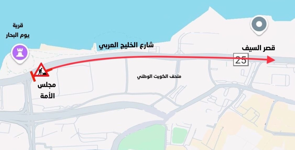 أعلنت الإدارة العامة للمرور عن إغلاق جزء من شارع الخليج العربي، من تقاطع مجلس الأمة الكويتي وحتى دوار قصر السيف، حيث سوف يتم إغلاق المسار الأيسر والمسار الأوسط فقط، وذلك من يوم الإثنين الموافق 4 الجاري وحتى الانتهاء من أعمال الصيانة للطريق بتاريخ 1 سبتمبر المقبل.