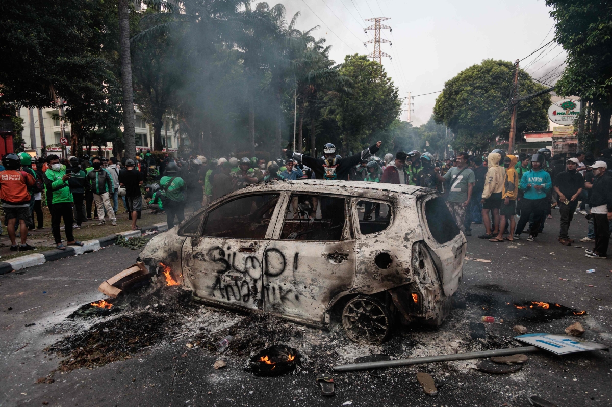 وتدفق سائقون وطلاب يرتدون سترات ملونة وإندونيسيون من مختلف شرائح المجتمع على مقر البرلمان ومقرات الشرطة في جاكرتا اليوم الجمعة للاحتجاج، ورشقوا البوابات بالحجارة ورددوا هتافا يقول «قاتل! قاتل!».
