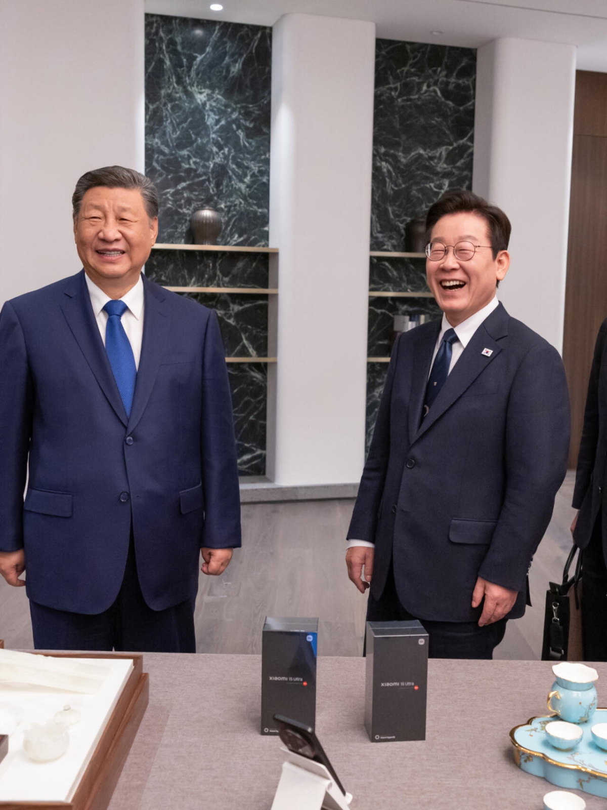 وقدّم شي هاتفين ذكيين من إنتاج شركة «شاومي» بشاشات مصنوعة في كوريا الجنوبية للي الذي علّق بالقول «هل خط الاتصال آمن؟»، ما دفع شي للضحك.