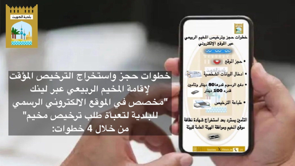 وأكدت فتح باب استقبال طلبات اصحاب المخيمات اعتبارا من يوم السبت الموافق 15 نوفمبر الحالي من خلال الموقع الالكتروني الرسمي لبلدية الكويت لإصدار تراخيصها المؤقته بعد دفع رسوم قدرها 50 دينارا، ومبلغ التأمين وقدره 100 دينار عن طريق «الكي نت» وان اشعارات طلب التخييم سوف تتم ارسالها عن طريق برنامج سهل لتأكيد عملية حجز المخيم.