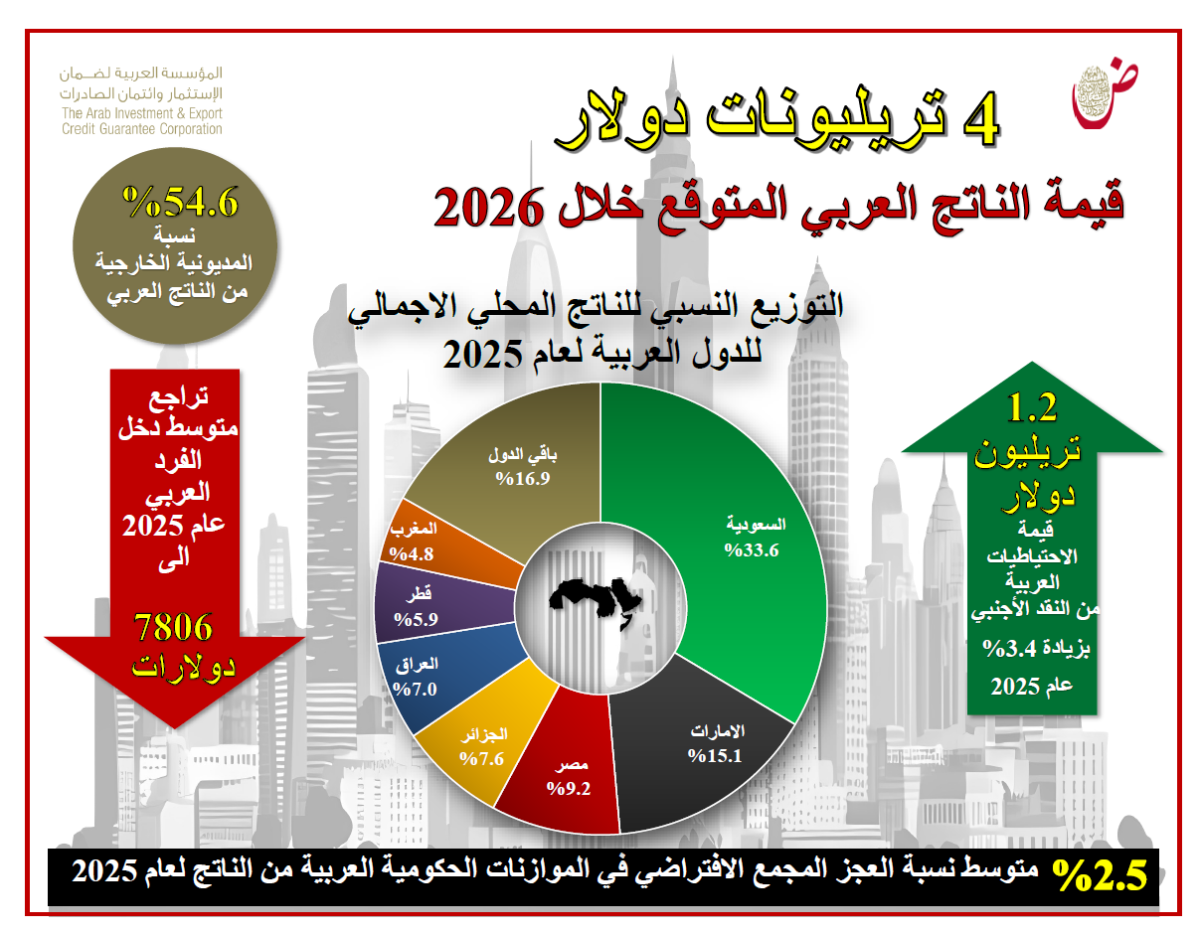 «ضمان الاستثمار»: 4 تريليونات دولار قيمة الناتج المحلي العربي الإجمالي 2026