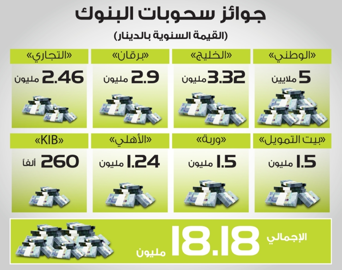 وتتوزع القيمة، بواقع 5 ملايين من حساب الجوهرة من بنك الكويت الوطني وتضم 3 ملايين سنوياً، وجائزة شهرية بـ125 ألفاً لفائز، وأسبوعية بـ 20 ألفاً، وفي المرتبة الثانية يأتي حساب الدانة من بنك الخليج بنحو 3.32 مليون موزعة على جائزة كبرى بـ2 مليون، ونصف سنوية بمليون، وربع سنوية بـ100 ألف، وسحوبات شهرية لـ 10 رابحين بجائزة 1000 دينار للفائز.