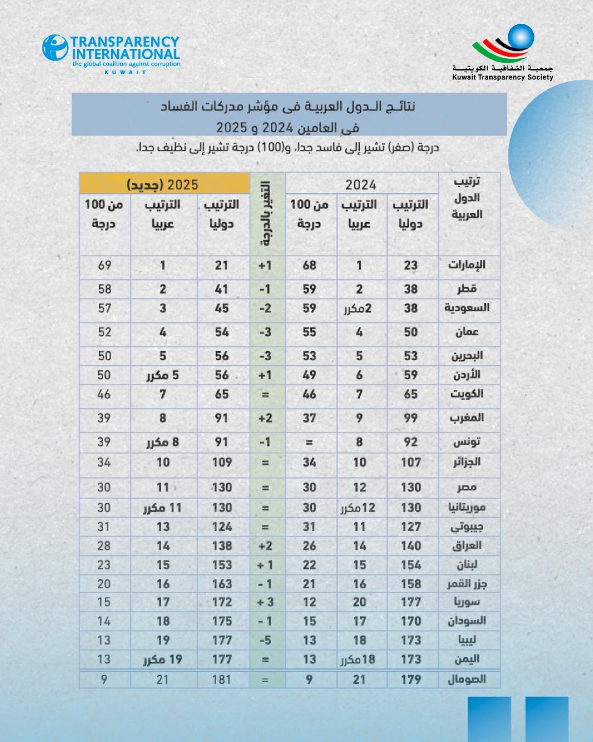 حافظت دولة الكويت على ترتيبها في مؤشر مدركات الفساد للعام 2025 الذي تم الإعلان عنه قبل قليل، بحصولها على 46 نقطة لتحل في المركز السابع عربيا والـ65 عالميا، وهي نفس النتائج التي كانت قد حصلت عليها الكويت في مؤشر 2024.