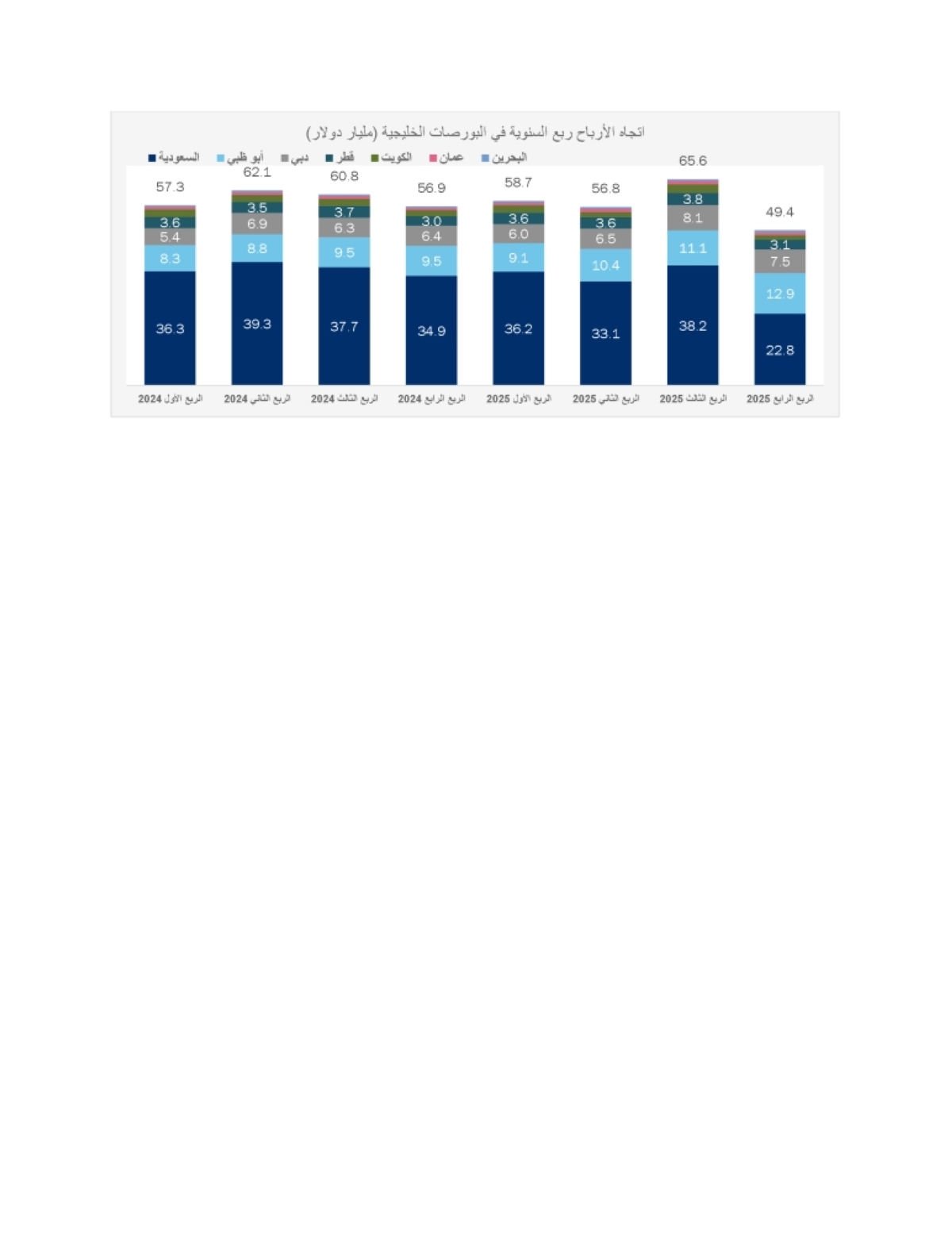 وعلى أساس سنوي، تراجعت الأرباح الإجمالية 13.2 في المئة، أو ما يعادل 7.5 مليار دولار، رغم تحقيق معظم الأسواق نمواً في الأرباح، إلا أن هذا النمو قابله انخفاض ملحوظ في أرباح شركات السوقين السعودي والكويتي.
