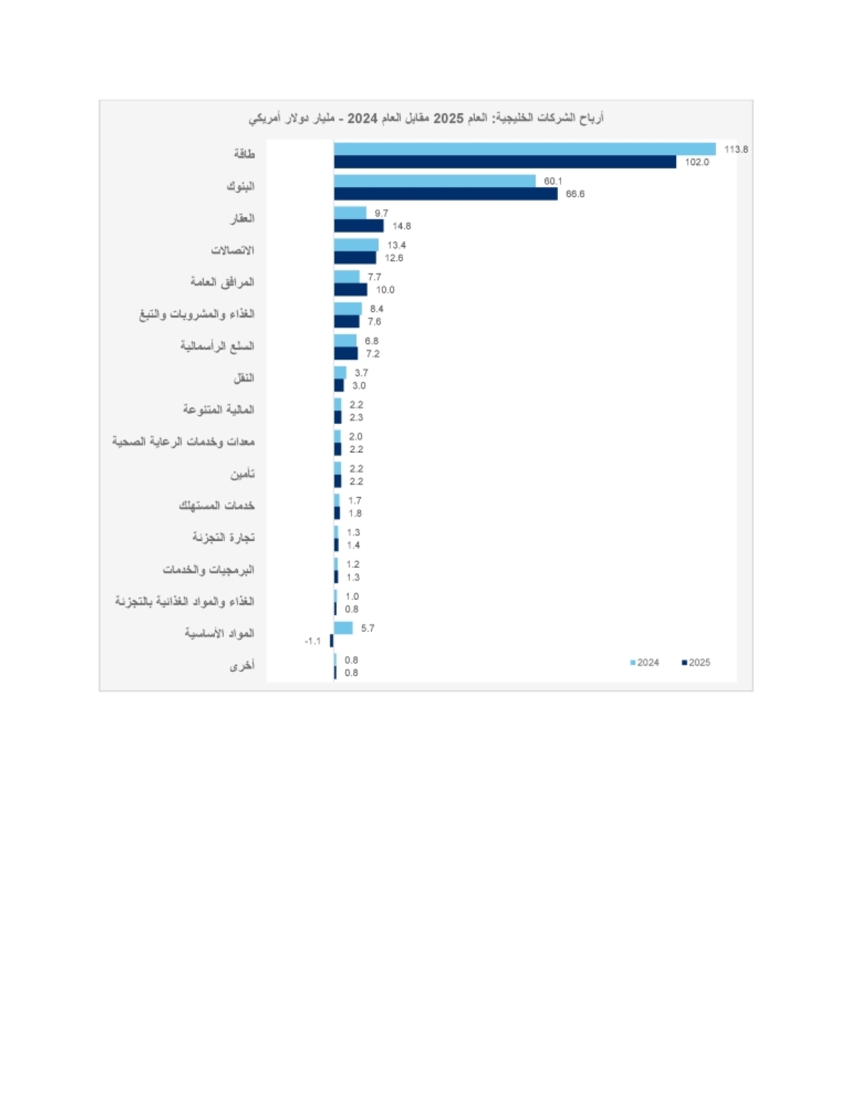 ولاحظ التقرير أن 11 قطاعاً مدرجاً من أصل 18 سجلت نمواً سنوياً في الأرباح. وسجلت البنوك أرباحاً صافية بـ 5.5 مليار دولار 2025، مقابل 5.4 مليار، بارتفاع هامشي 0.6 في المئة.