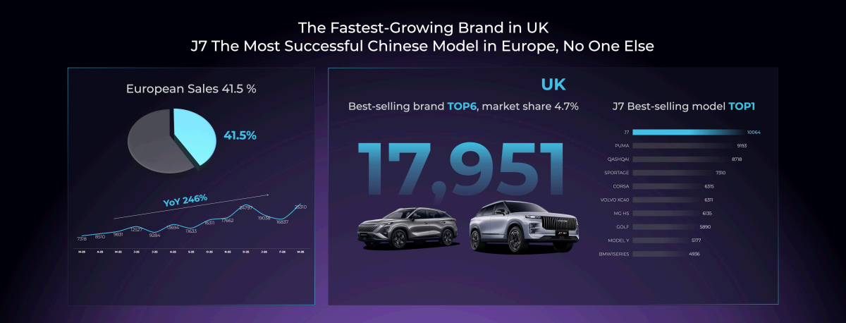 وفي السوق البريطاني، سجلت «أومودا» و«جايكو» حضوراً لافتاً بحلولها في المركز السادس ضمن مبيعات العلامات التجارية بحصة سوقية بلغت 4.7 %، مع بيع 17951 سيارة خلال شهر واحد، فيما تصدرت «JAECOO 7» قائمة الطرازات الأكثر مبيعاً، في تأكيد جديد على قوة حضور العلامة في الأسواق الأوروبية عالية المنافسة.