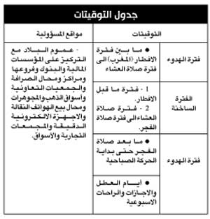 قسمت الخطة توقيتات عملها إلى فترتين الأولى هي مرحلة الهدوء، بين فترة الافطار إلى قبل صلاة العشاء، وبعد صلاة الفجر حتى بداية الحركة الصباحية، وايام العطل والاجازات، والثانية الفترة الساخنة وتبدأ منذ بداية الحركة الصباحية حتى موعد الافطار، ومن قبل صلاة العشاء حتى صلاة الفجر)... وهنا نص الخطة: