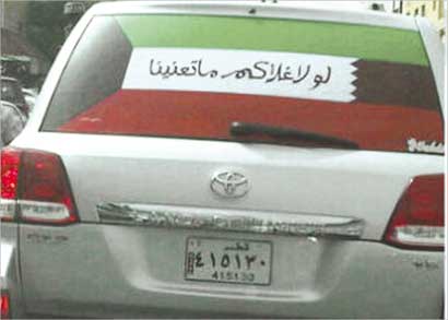 المواطن القطري رسم عبارة الغلاء والمعزة وسط علم الكويت الذي زين به زجاج سيارته اليابانية الخلفي، معبراً عن وحدة الصف والتلاحم بين مواطني دول مجلس التعاون... ودامت افراحك يا كويت.